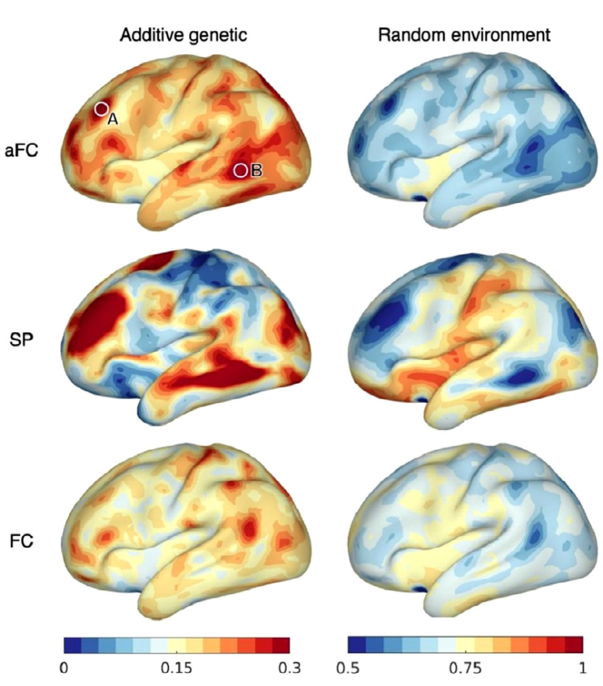 Genetic and environmental influences on variability Based on fMRI data of twins, we investigated the influence of genes and environment on variabilty of fine-grained spatial layout of function, as well as connectivity strength between areas. Functional aligment was used to disentangle function and anatomy. We observed that genetic influence on variability of the spatial layout is inhomogeneous across the cortex and tends to increase with variability itself. Genetic influence on variability of connectivity strength, on the other hand, was more homogeneous across the cortex and lower everywhere than environmental influence. (Burger et al, 2022)