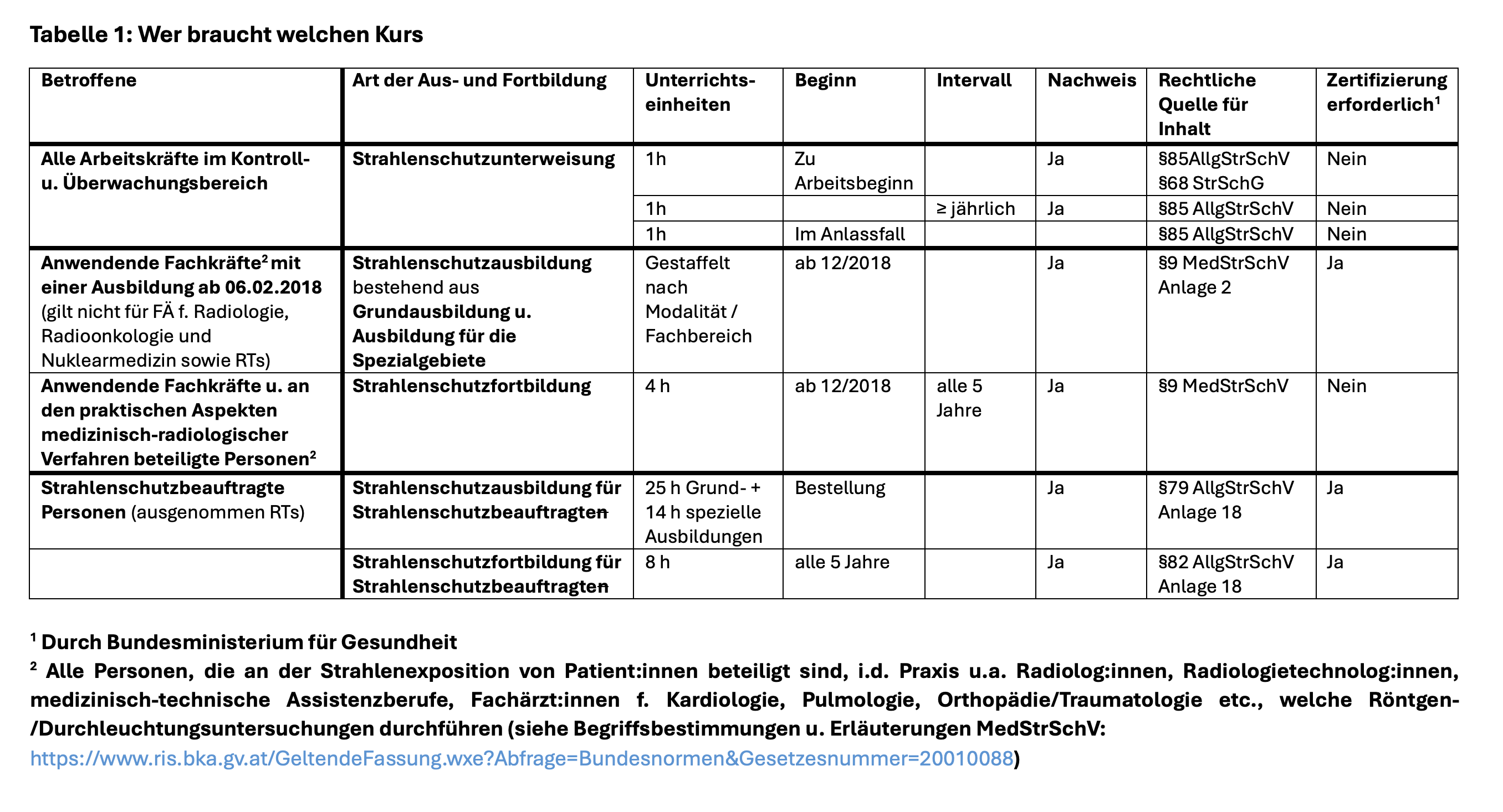 Tabelle 2: Strahlenschutzausbildung für anwenden Fachkräfte laut. Anlage 2 Z1-5 der MedStrSchV