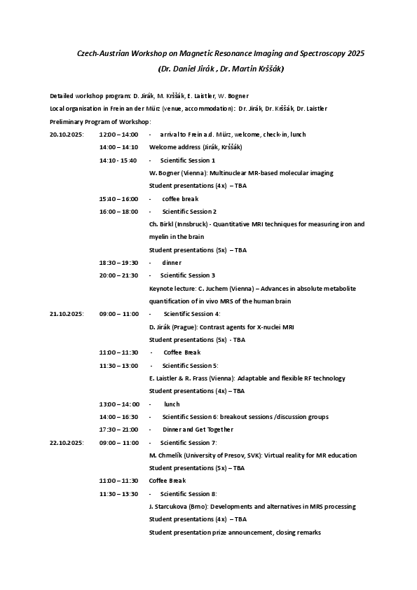 This encounter offers a great opportunity to meet a mix of young and senior scientists at all graduation levels, which is often not possible at highly specialized international conferences. It is a meeting point of Czech and Austrian academic sites involved in the methodological and application research of in vivo MRI and MRS.